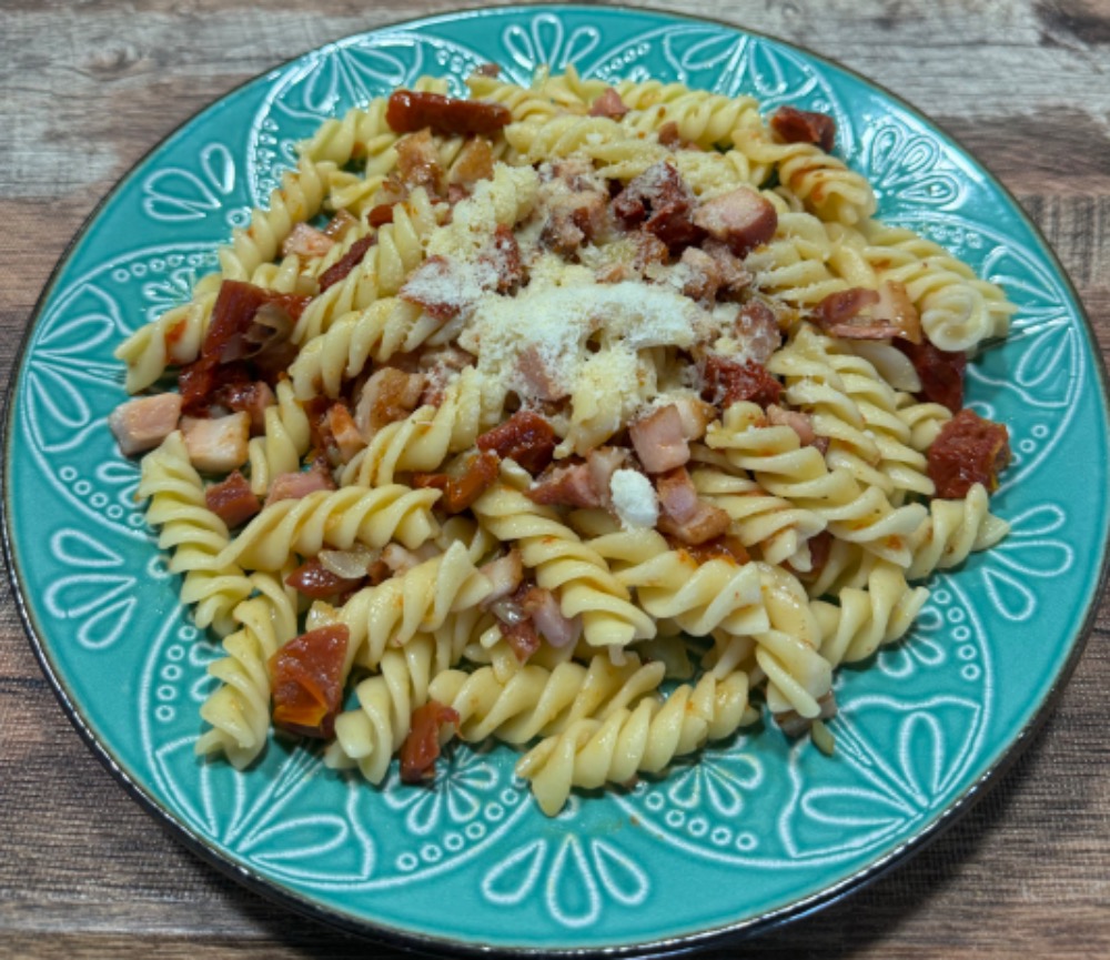 fusilli, slanina, sušená rajčata, olivový olej, směs tvrdých sýrů