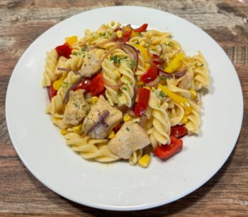 fusilli, kuřecí maso, paprika, kukuřice, cibule, olivový olej