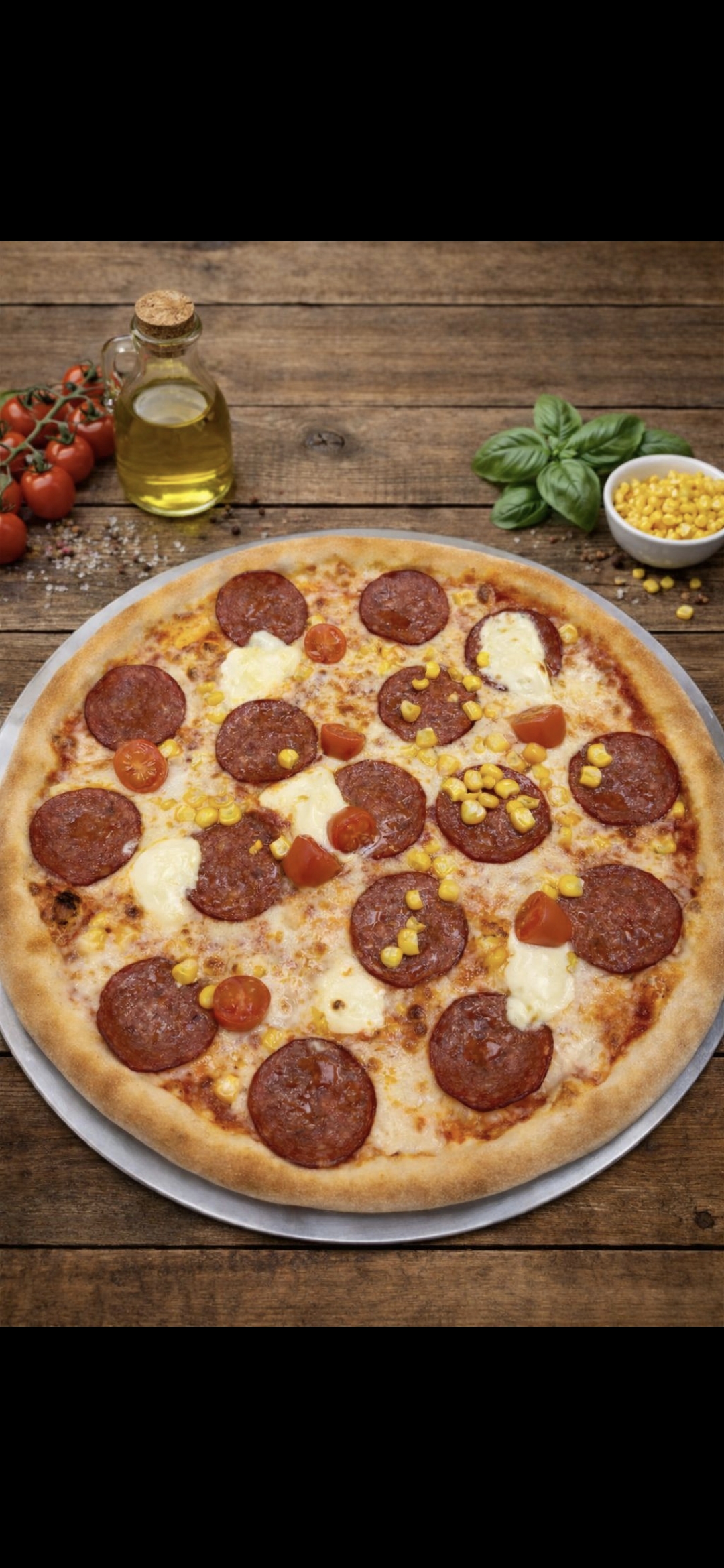 tomato, mozzarella, salám, mascarpone, kukuřice, cherry rajčata